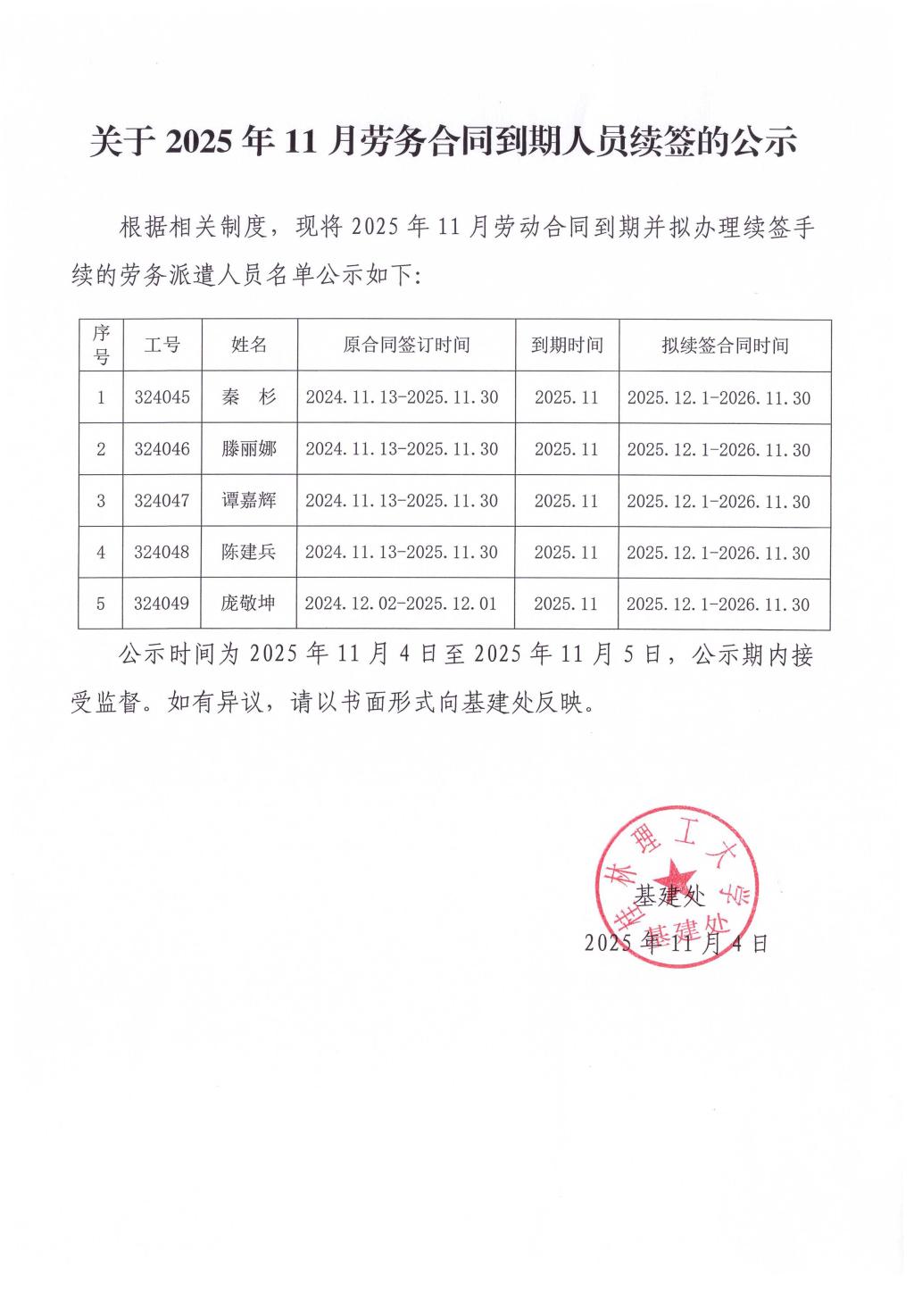 2025年11月劳务派遣人员拟续签合同公示表