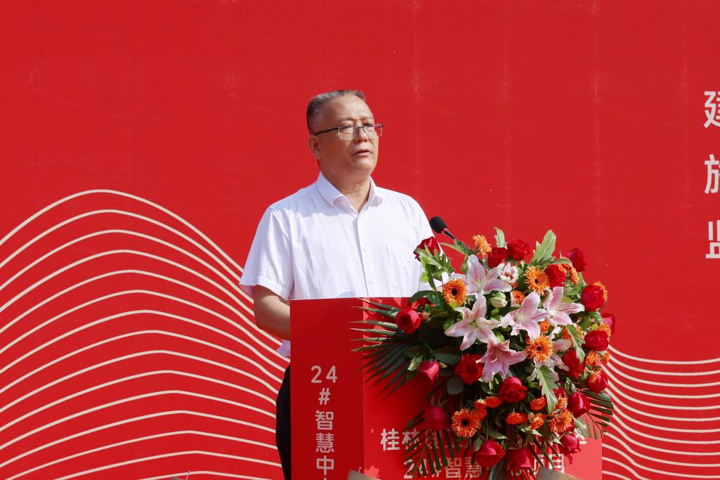 王敦球校长在致辞中代表学校对参加开工仪式的各位领导、来宾表示热烈欢迎,向一直以来关心支持我校建设发展的自治区教育厅、桂林市及各级领导表示崇高敬意。他指出,建设雁山校区24#智慧中心项目,是学校发挥智慧教育新优势、大力推进智慧校园、“数字桂工”建设新画卷中浓墨重彩的一笔。他强调,施工单位要精心组织、精心管理、精心施工,确保工程建设安全、稳定、有序推进,保质、高效、按期完成;监理单位要强化责任意识,加强施工监管,强化质量监督,确保按质按量完成项目监理工作;学校基建处等部门要压紧压实各建设参与方责任,科学统筹项目管理,确保24#智慧中心项目建设稳步推进,如期建成,合力打造出师生满意、经得起时代和历史检验的精品工程、典范工程。