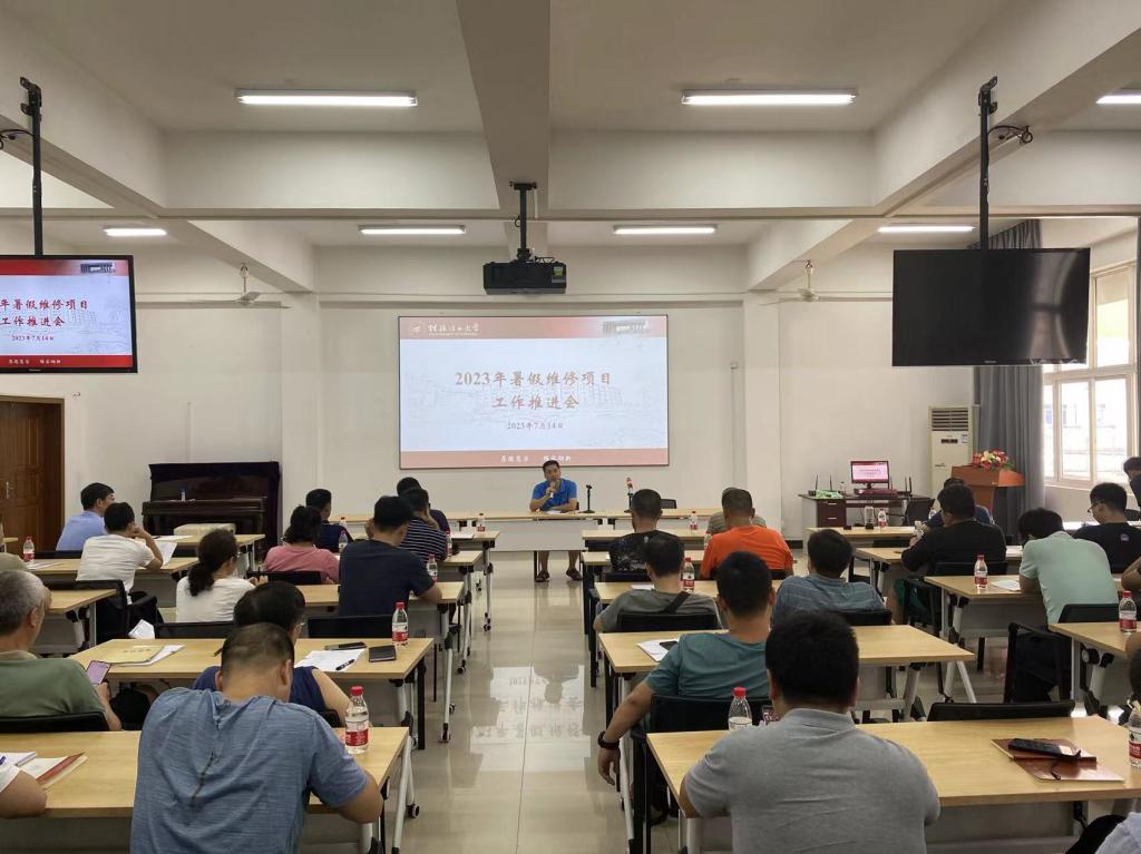 为确保学校暑期各项维修改造工程按期完工,保障新学期顺利开学,7月14日下午,基建后勤处在屏风体育馆副楼212会议室召开2023年暑期维修项目工作推进会。基建后勤处主要负责人、相关使用部门负责人、暑期项目施工单位项目经理参加会议。