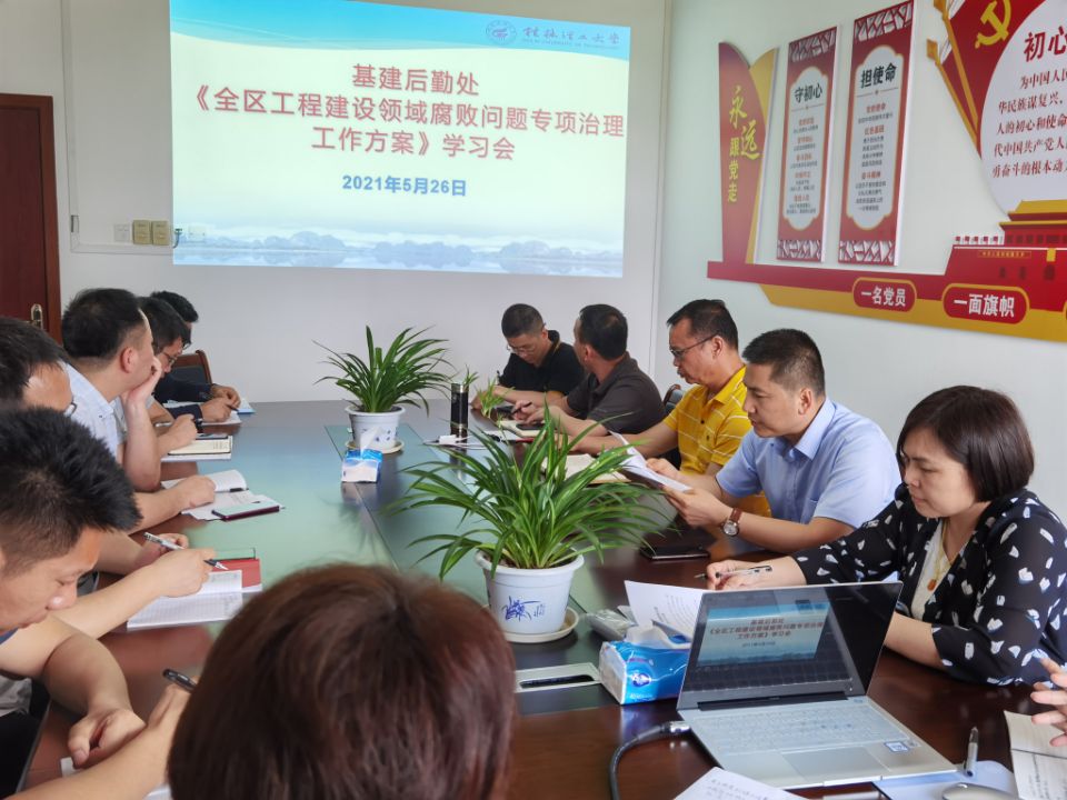 5月18日下午,基建后勤处在雁山行知楼B座510会议室召开廉政教育学习会,全处科级以上领导干部参加了会议,会上由代武社处长领学了《全区工程建设领域腐败问题专项治理工作方案》的文件精神。