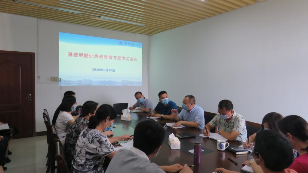 基建后勤处于6月16日下午组织全处干部职工在雁山行知楼B座510会议室召开廉政教育专题会议,学习会由处长代武社主持。学校纪委副书记、监察室主任华桂林做了专题学习辅导。