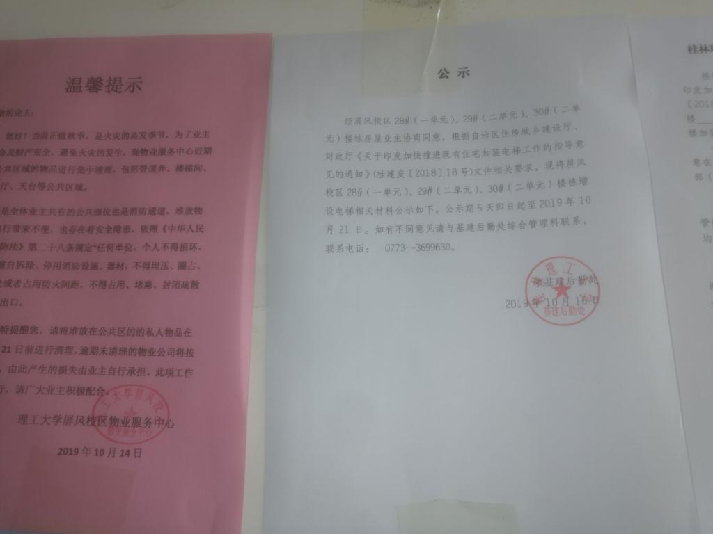 10月中旬以来,基建后勤处班子成员带领技术科、后勤管理等科室党员,多次到屏风校区住宅区28#、29#、30#栋退休老师家中,入户讲解政策、收集住户意向表、房产证件等资料,到小区公示项目协议书、设计方案、效果图,出具论证报告等,积极推进加装电梯工作。