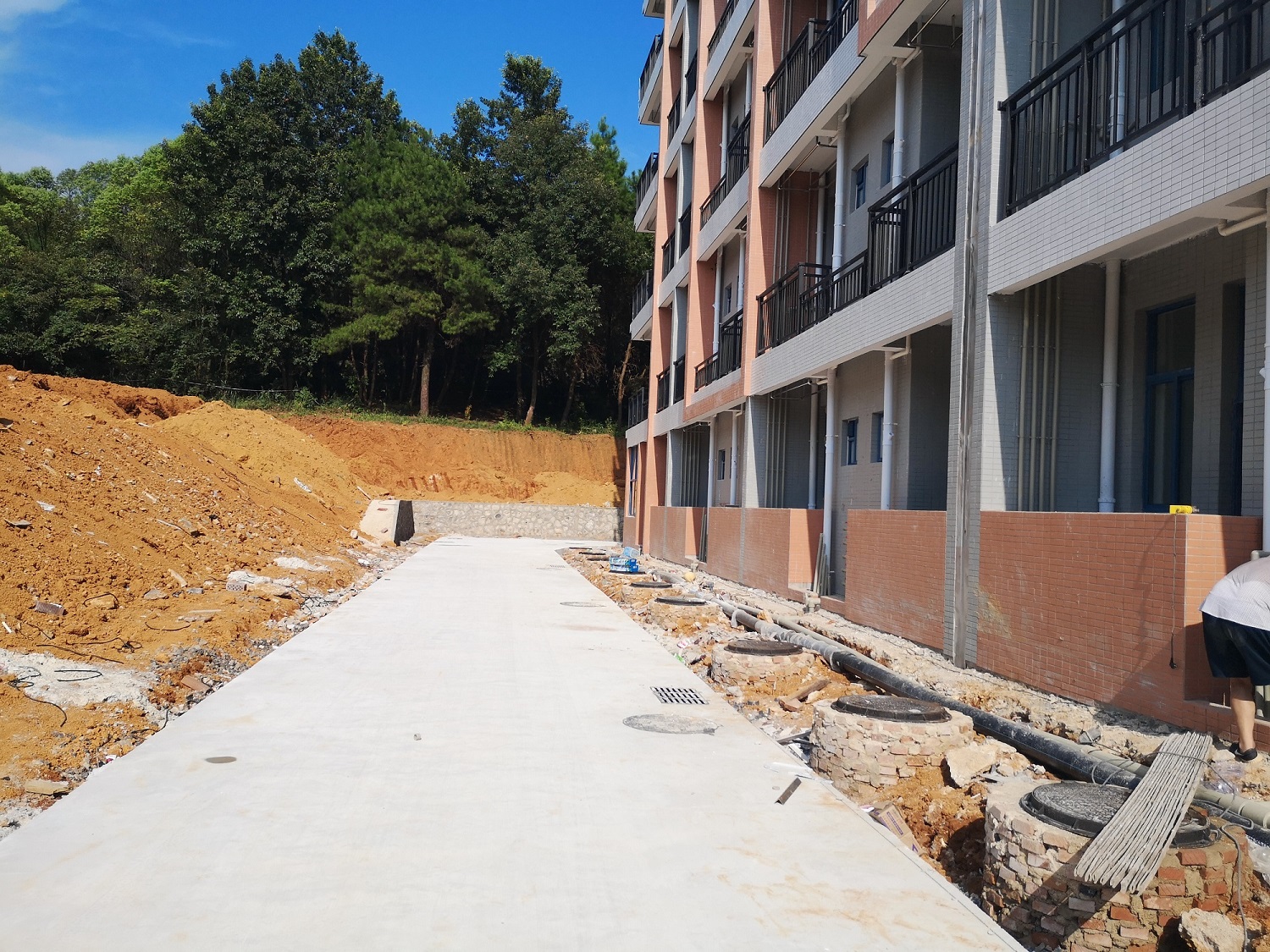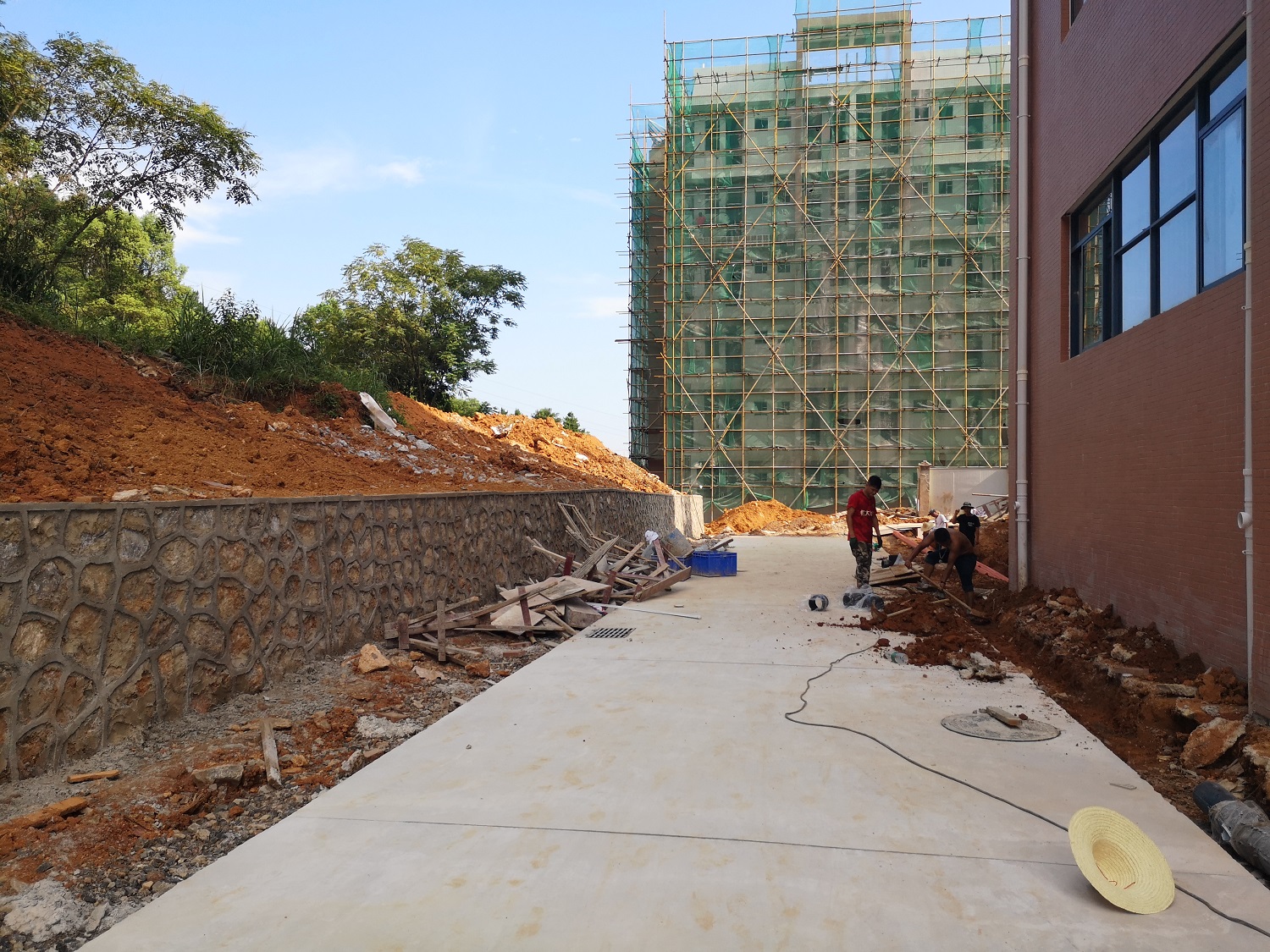 代处强调注意施工安全以及暑期防暑,在保证质量安全的前提下把控施工进度,确保8月5日前附属道路及宿舍出入口等场地能够满足后勤集团进空调和家具的要求。孟永华副处长也对6#学生宿舍北侧雨污水井以及东侧挡土墙后土坡施工方案结合实际情况进行方案探讨以及技术指导。